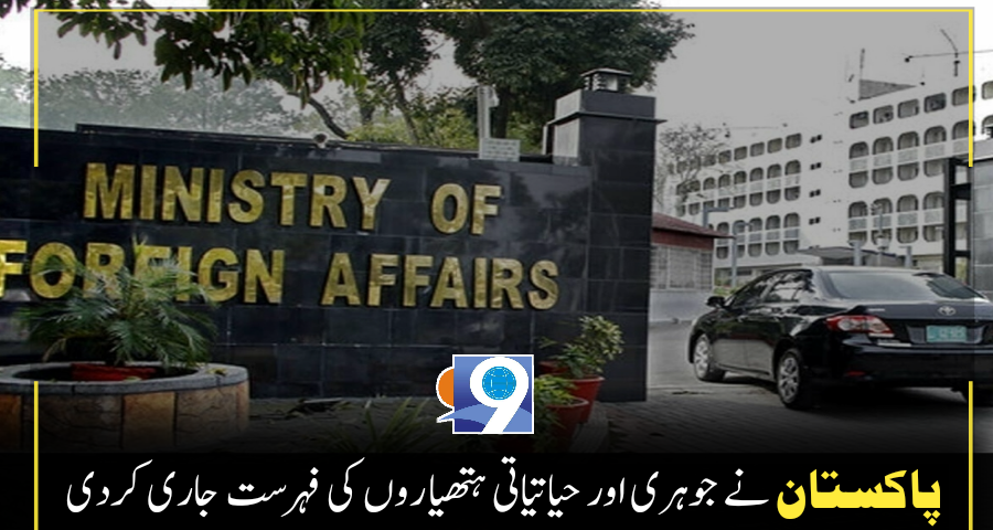 دفترخارجہ کی جانب سے جاری ہونے والے بیان کے مطابق پاکستان نے جوہری اور حیاتیاتی ہتھیاروں اور ان کی ترسیل پر پابندی کے حوالے سے نظر ثانی شدہ فہرستوں کا نوٹیفکیشن جاری کردیا ہے۔